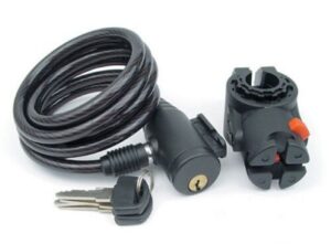 Špirálový zámok AUTHOR, lanko-oceľ, priemer 8 mm x dĺžka 1500 mm, univerzálny otočný držiak na sedlovku, kľúč.