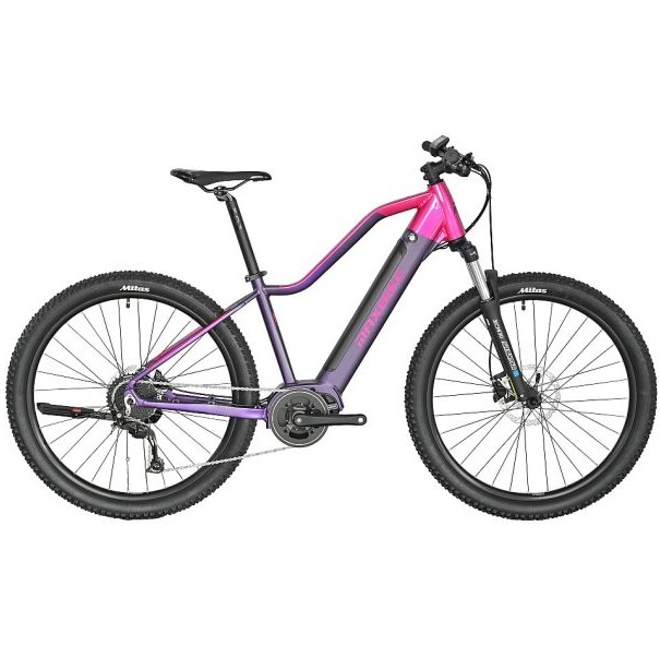 1×9 dámsky hardtail 27,5/29″ horský elektrobicykel so stredovým motorom Bafang M200 (250 W, 65 Nm), do rámu plne integrovaná batéria 504 Wh, 14 Ah, vidlica Suntour XCM HLO 29″ disc, radenie Shimano Alivio 1×9, prehadzovačka Shimano Alivio RDM3100SGS, brzdy Shimano MT200
